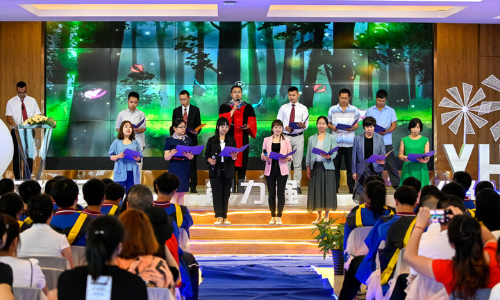 毕业典礼仍然注重强烈的仪式感,是继星空节,篝火晚会之后,初三孩子们生命历程中第一次告别的重要记忆。师生们都盛装出场,学生穿黑色全套仿学士服,校长们穿校长服,和班主任们穿红色仿博士服,科任老师穿职业正装。既拍个人照,拍集体合影,还出动无人机空中拍照和录视频。学校请的摄影师团队,家委会请的摄影师们,还有用手机拍录的家长们,都忙着抢占最佳位置。以浪漫的形式快乐地展示自己的美,并从中体验生活的快乐,领悟生活的意义,学习制造快乐的能力。这难道不是又一次生命教育?