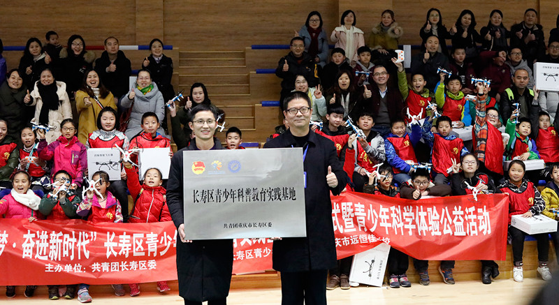 飞行体验结束后,共青团重庆市长寿区委举行了“长寿区青少年科普教育实践基地”授牌仪式,王振权校长从团区委书记周剑手中接过了牌匾,全场师生家长见证了这个光荣的时刻。