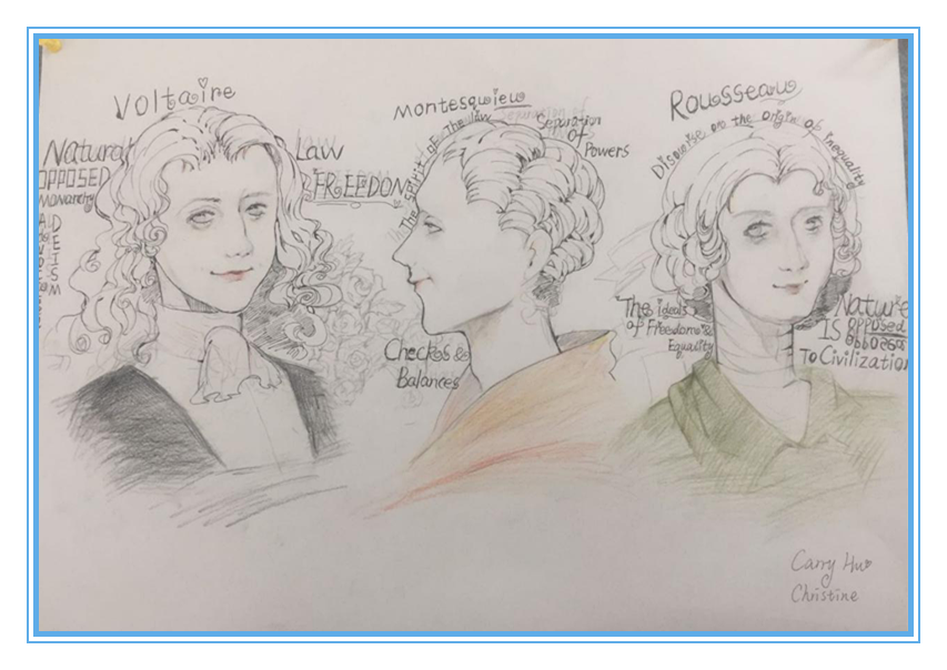 远恒佳的校训是“我,不一样!”是的,这一理念已经深深地烙刻进学生的骨髓里。我们相信,每一个孩子都是独一无二的天才。来到远恒佳,在精英老师团队和学校良好氛围的熏陶和感染下,Carry逐渐形成了自己的独特个性(Unique personality),成为了独一无二的自己。遇事认真思考,潜心挖掘自己独特的见解,敢于敞开心扉,自信地与大家分享。同时发挥自己天赋异禀的绘画才能,将自己对世界历史、生物等课程的理解尽情挥洒到画作中,让老师和同学们对一些看似空洞或乏味的话题有了全新的参悟。比如: