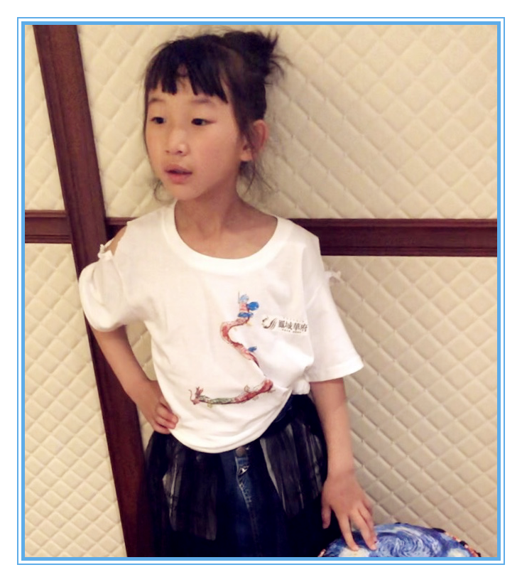 她喜欢李老师的美术课。在李老师的表扬和鼓励下,她迷上了画画。每天都会把自己心中所想画出来。瞧!这是她为自己这个小龙人设计的一件T恤。