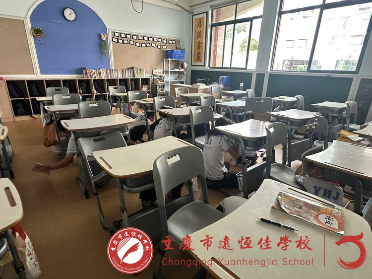 14:20演练模拟地震发生,警报声响起后,学生迅速采取避险措施,躲在课桌下或墙角,用双手或书护住头部。